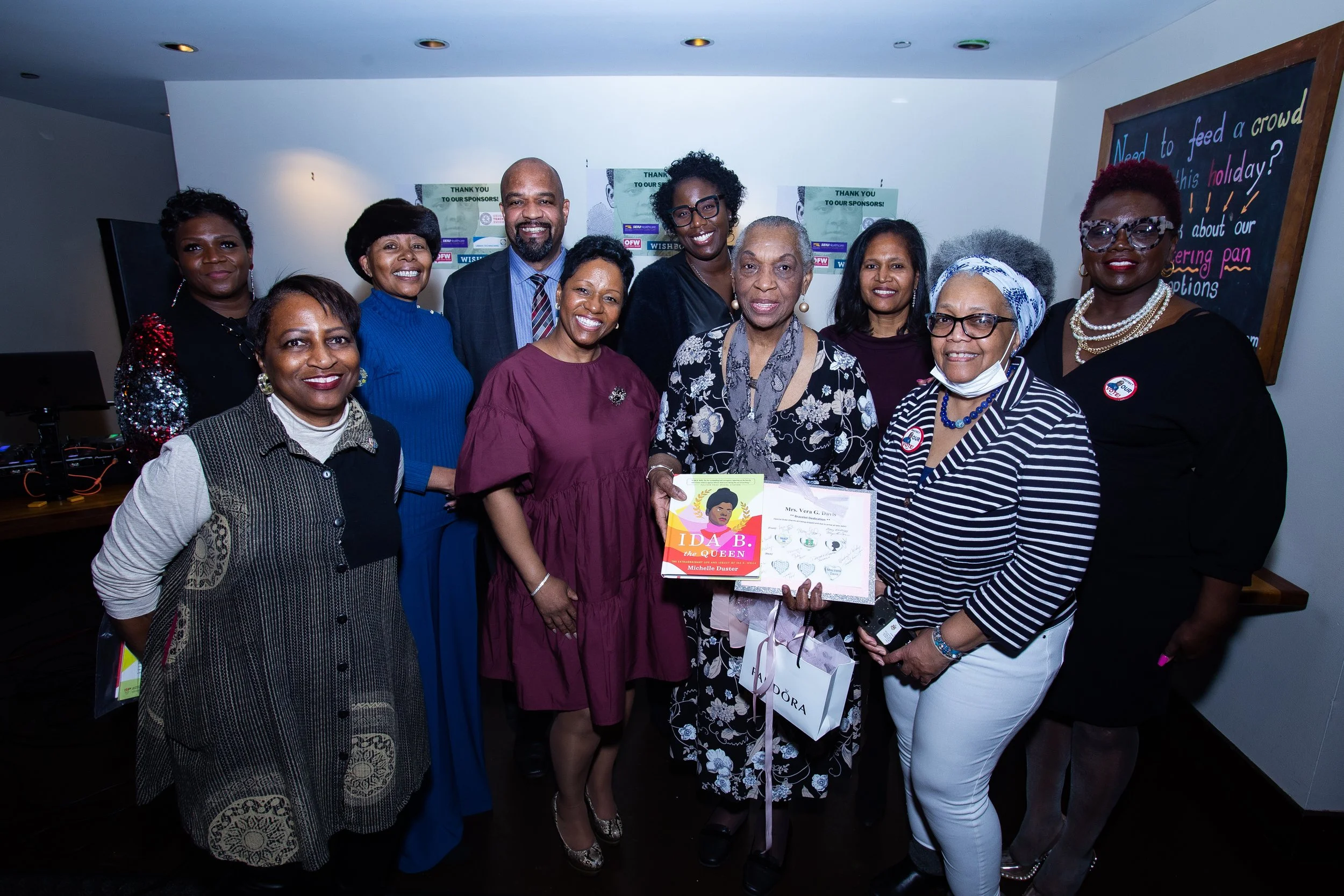 On Sunday March 20, 2022 — 80 noteworthy women in leadership gathered at Wishbone Restaurant for our Second Annual IDA B. WELLS Alpha Suffrage Club Diner. Those in attendance were treated to a wonderful panel discussion that included: Alderman Sophia King, CTU Recording Secretary Christel Williams, Daniel Duster ( great grandson of Ida B. Wells ) — along with several awards presentation to outstanding women in leadership: on the west side and beyond — not to mention an Art by BADU live installation of Ida B. Wells, commissioned by Urban Technicians.
